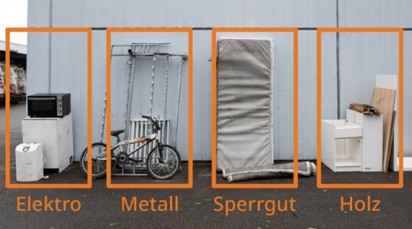 das Sperrgut muss sortiert bereitgestellt werden. Das bedeutet sortiert nach: Holz, Elektroschrott, Metallen und sonstigem Sperrgut